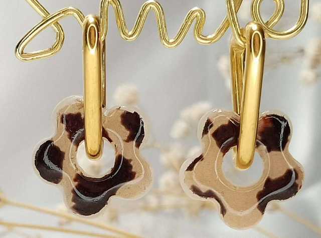 Composées de délicates fleurs en pâte polymère avec un motif léopard audacieux, ces boucles d'oreilles apportent une touche sauvage à n'importe quelle tenue.