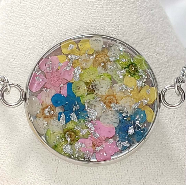 Laissez-vous séduire par la douceur et la poésie de notre Bracelet "Ciel Fleuri". Ce bijou unique est une véritable œuvre d'art miniature, capturant la délicatesse de fleurs séchées véritables, subtilement agencées dans un médaillon rond et transparent en résine de haute qualité.